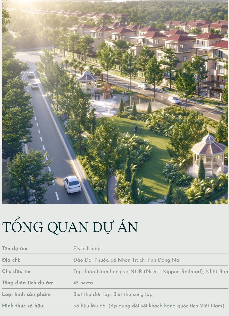 Elyse Island là khu đô thị được phát triển bởi Nam Long Group (NLG) tập đoàn Bất động sản tích hợp hàng đầu Việt Nam và đối tác đến từ Nhật Bản (Nishi Nippon Railroad (NNR). Dự án Elyse Island tọa lạc tại đại chỉ: Khu đô thị Nam Long Đại Phước, xã Đại Phước, Tỉnh Đồng Nai, Việt Nam.